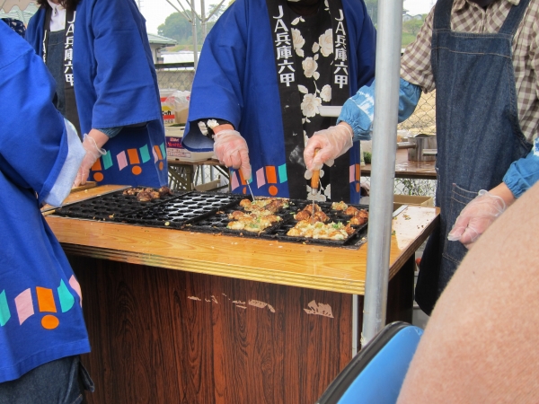 タコ焼8個もキツネうどんも200円です。安っ!婦人会の奥さん達がお世辞にも上手と言えない手つきで必死に焼いておられます。いいにおいがしています。